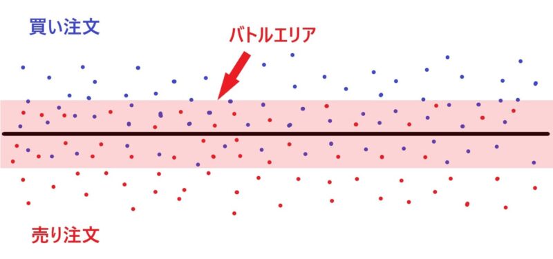 水平線に近いほど、買いと売りが混在し、どっちに転ぶかわからないバトルエリアが存在していると考えられます。
