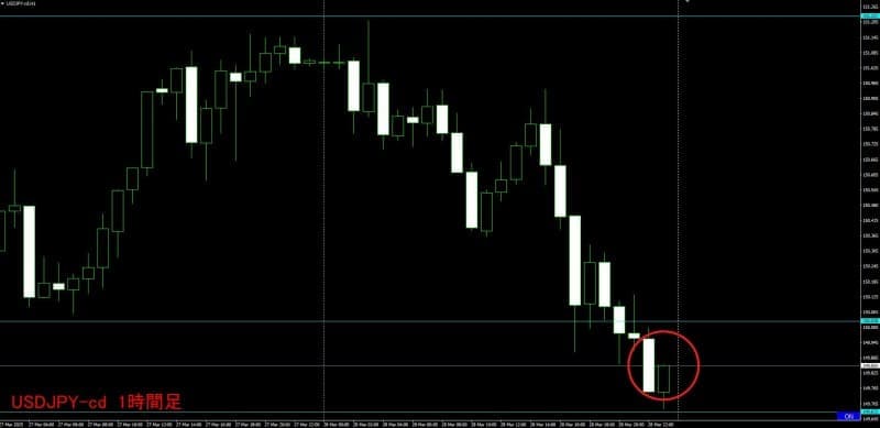 こちらが土曜日に見たUSDJPY(ドル円)の1時間足チャートです。