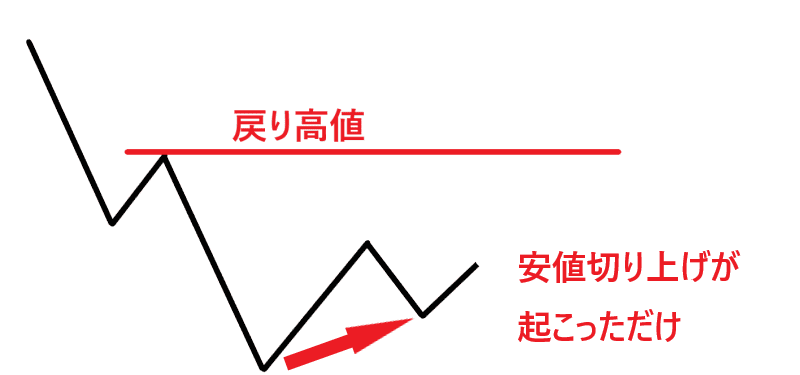戻り高値が上にある以上、「下降トレンドは継続している」と考える大衆心理が強いと考えられるからです。