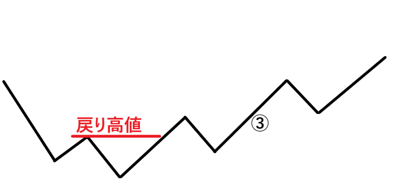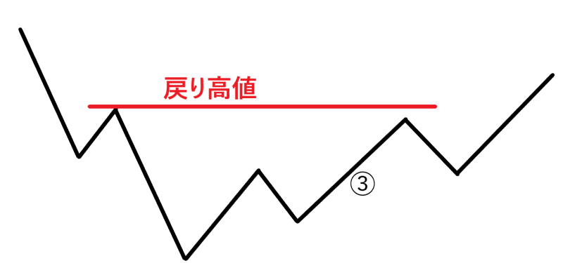 このように、下降中につけた戻り高値ラインが上にある場合、3波での買いエントリーはできません。