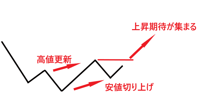 さらに、赤ライン上抜けで、安値切り上げからの高値更新という正しい順序の上昇トレンド確定となるため、さらに上昇期待が集まりやすくなります。