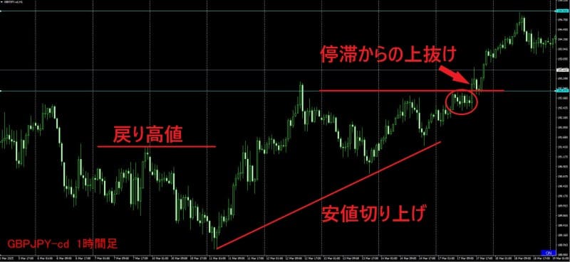 まず、最安値からの上昇で下降時に付けた戻り高値を上抜けます。