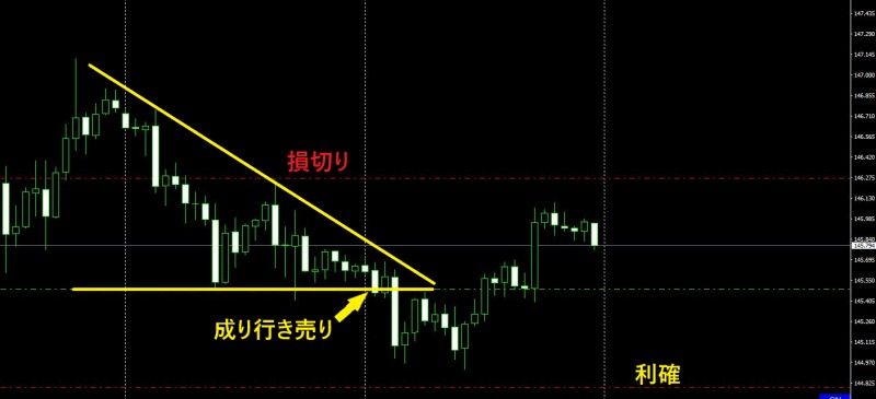 形としてはディセンディングトライアングルの下抜けでのエントリーです。