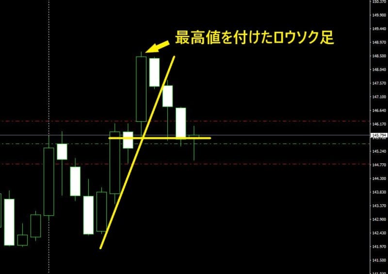 特に注目しているのは、最高値を付けたロウソク足の安値を抜けるかどうかって局面。(上昇から下降への転換)