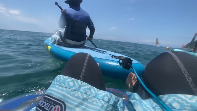 【写真】先日の天気の良い日、私は大きな浮き輪に乗って友だちのサップで引っ張ってもらっているところ。