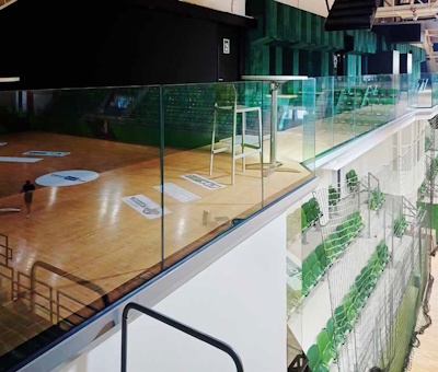 側面取付(そくめんとりつけ)のガラス手摺(てすり)は、建物のバルコニーや階段などに設置される手摺で、