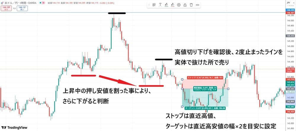 そうしたら、上の様に、チャートにトレードを行う根拠を書き込んでいきます。